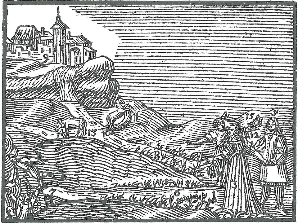 Dieses Leben ist ein Weg; oder ein Scheidweg gleich dem Buchstaben des Pythagoras Y; dessen linker Fußsteig breit (1), der rechte äng (2) ist: jener ist des Lasters (3) dieser der Tugend Steig (4).